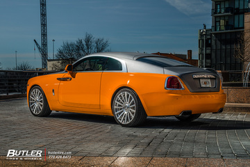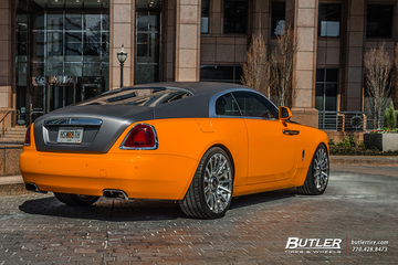 With the Wraiths already eye-catching color scheme, we had to find the perfect wheels to match. And we did exactly that by installing 22in AG Luxury AGL20 wheels with custom fitted floating RR center caps. The AG Luxury wheels have an elegant brushed and polished finish to compliment the Wraiths appearance perfectly. To finish it off, we of course had these astounding 22in wheels wrapped in Michelin Pilot Super Sport tires. No matter where you take this Butlerized Rolls Royce, it will always turn heads!